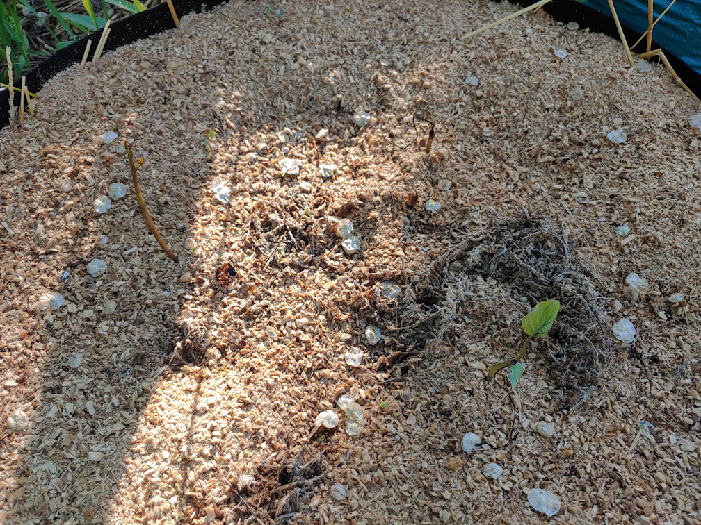 It looks like we have one, maybe two, losses among the sweet potatoes. They don’t look like they’ve been eaten by anything. One just looks withered away. The other still has a leaf trying to grow, while the rest has withered away. The rains might have something to do with it. I don’t know. We did have two extra slips in our package, though, and the grow bag is probably too small for 3 plants, so this is not necessarily a bad thing.