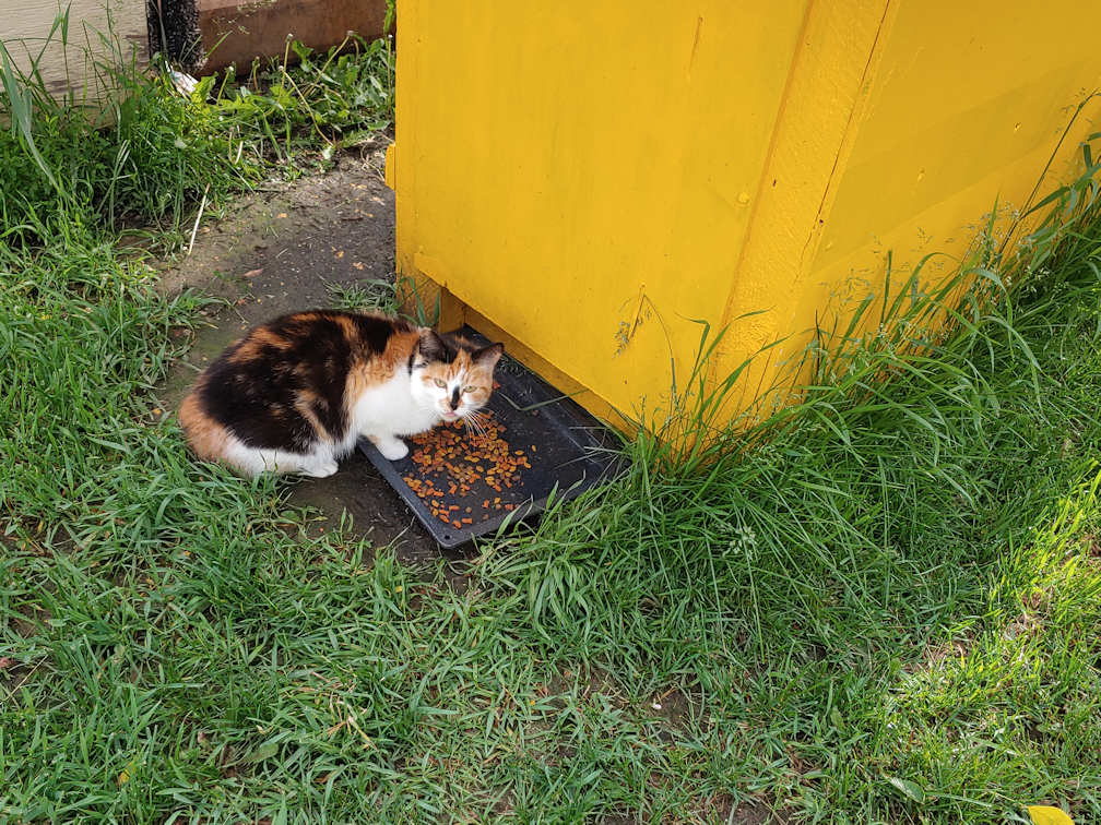 Broccoli is one that runs from place to place to eat. Most of the cats will eat in the kibble house. Some prefer the tray under the shrine. Others prefer this tray outside the kibble house. Now that I’m putting kibble on the roof of the cat’s house, some clearly prefer that, too (no skunks up there!). Broccoli, meanwhile, has no preference, except maybe the roof. She just runs back and forth, from spot to spot!