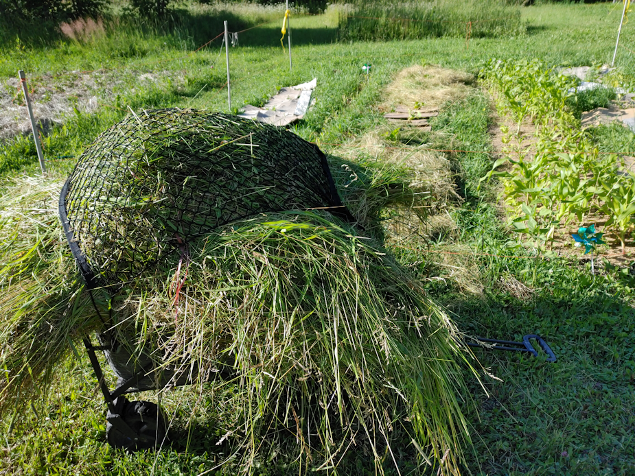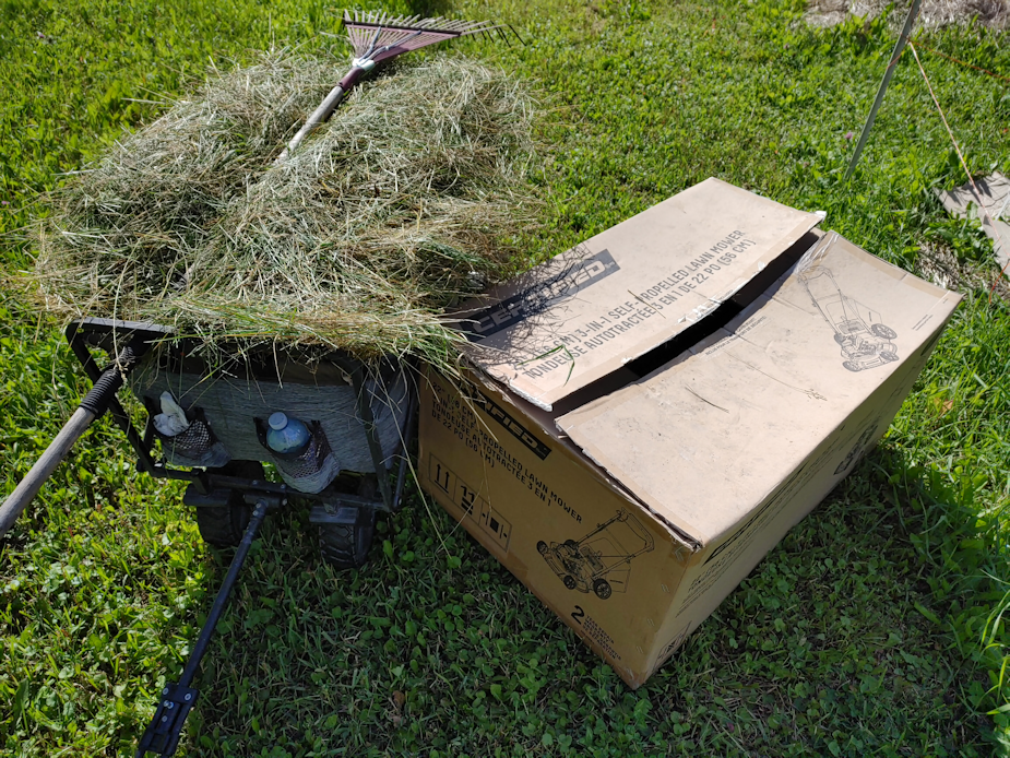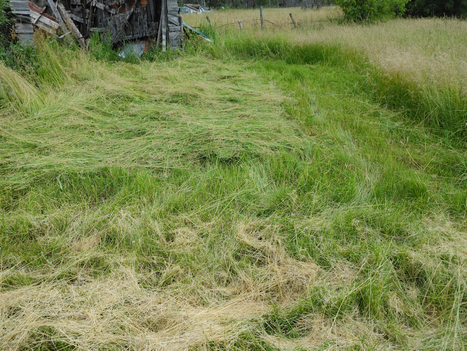 In the foreground of the photo, you can see some of the dried hay from when I tried using the weed trimmer to cut this. I gathered all the previously cut hay into the wagon and hauled it to the garden.