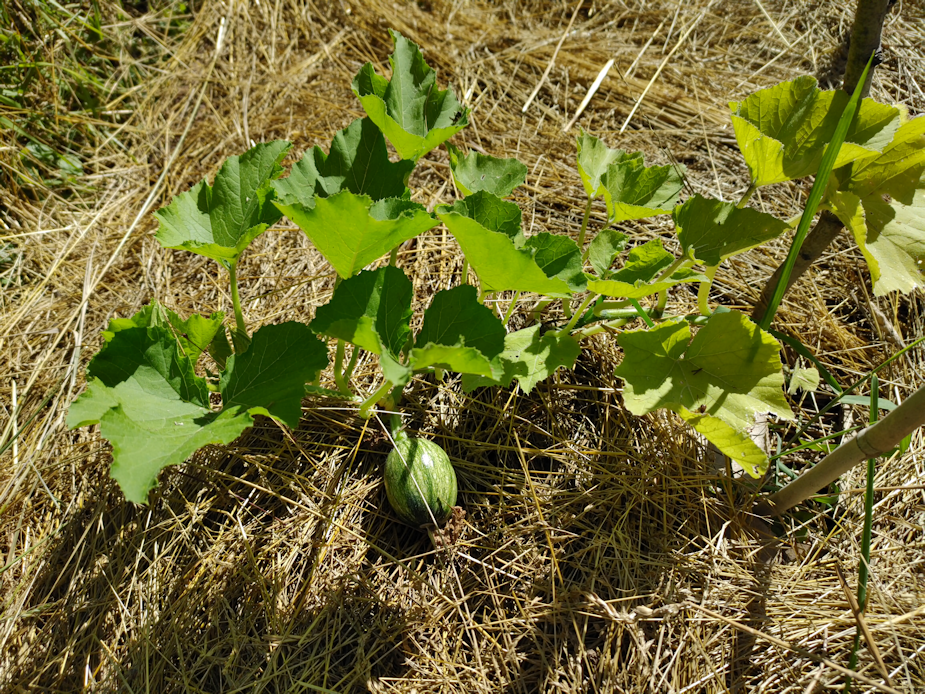 Three of the four apple gourds are getting pretty tall and starting to climb the poles next to them. I attached pairs of bamboo poles as cross pieces between the three poles, so they’ll have horizontal support as they grow bigger. Only one of the apple gourds is tall enough to actually benefit from the new support, but the other two should be there, soon. As for the fourth plant, it is so small, it’s barely visible over the cardboard mulch!