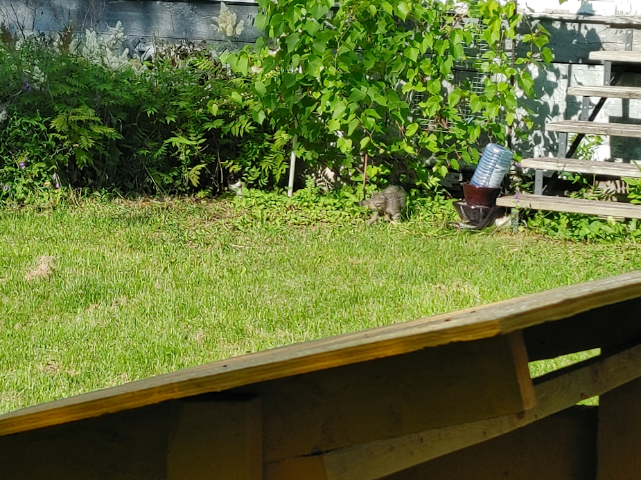 Oh! Last night, while crossing the outer yard, I might have, maybe, possibly, seen a kitten following Broccoli into the tall grass. The first possible sign of her litter.