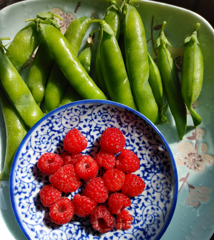 I was able to make a tiny harvest of shelling peas this morning; more of the pea plants have had hair cuts by a deer, it seems. Just at the one end, where they are already all spindly, though, so it’s not actually much of a loss. I was able to pick a small handful of raspberries, too. Not as much of either, as yesterday.