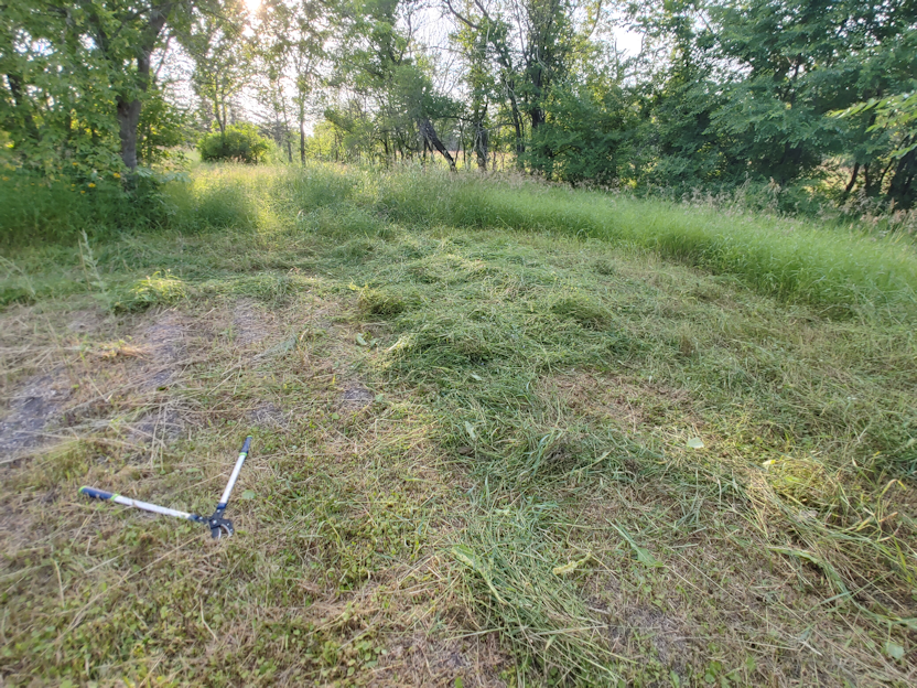 I did a bit more beside the main garden. Hit another patch of mostly alfalfa, which made cutting difficult. Then I did the paths in the maple grove. The grass there is sparse, and there’s about as much creeping bellflower as grass. That went quite easily.