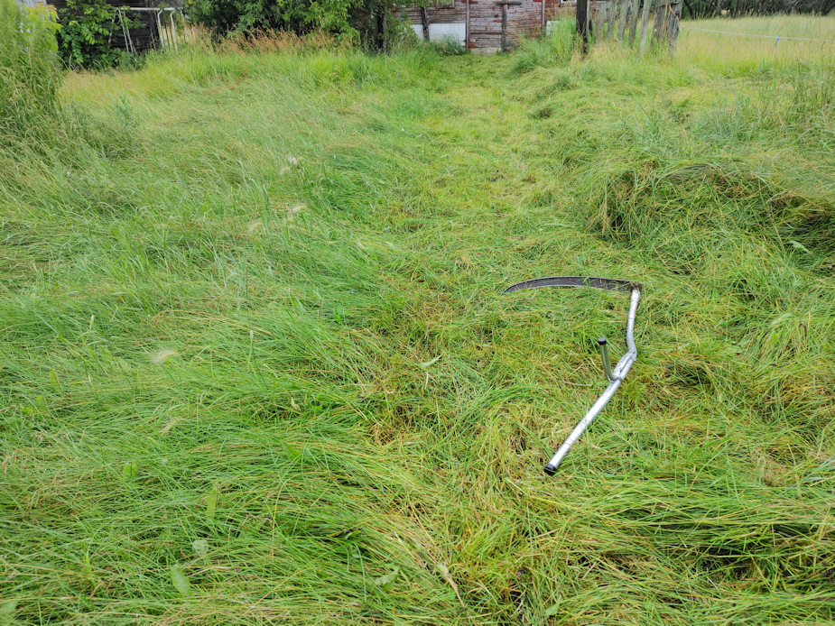 There had been predictions for more rain this afternoon, but when things stayed dry, I headed out with the scythe.