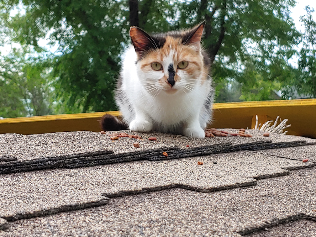Or does she want to enjoy her private breakfast on top of the cats’ house, away from the other cats?