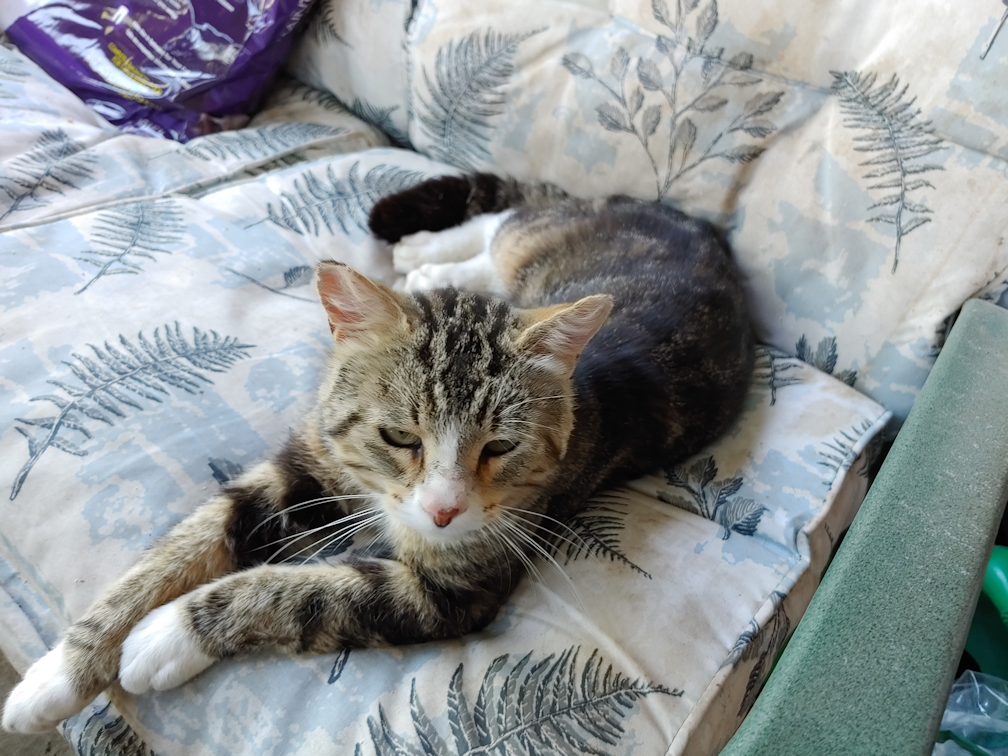 The tom that’s hanging around the most right now is Sad Face. He’s definitely the winner of the male cat hierarchy, so I am happy to have Potato safe in the sun room. I still see The Distinguished Guest, though not as often, and he’s more skittish. He still has a missing patch of fur on one shoulder. I’ve never been able to get close enough to see it well, but the colour is looking more like normal skin colour, rather than open wound or scabbing colour. I suspect it will scar over and remain a bald spot, rather than the fur growing in. All our other males have disappeared. Perhaps they’ll come back later in the season and stay for the winter, or simply disappear, as so many others have since we’ve moved here. I prefer to think they’ve found some other farm to call home.