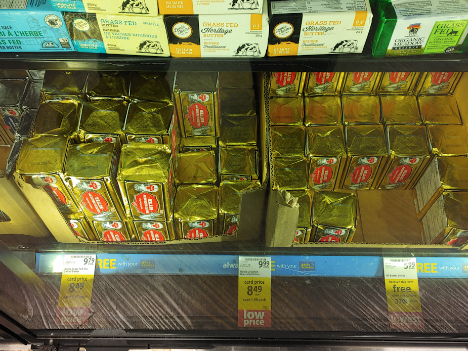 I didn’t buy butter, but I did end up buying some ghee. The sale price for the jar was almost $23/US$17.54 It’s shelf stable, though, and has a higher smoke point, to it may be worth it. We’ve never used ghee before. If we like it, we’ll learn how to make our own ghee.