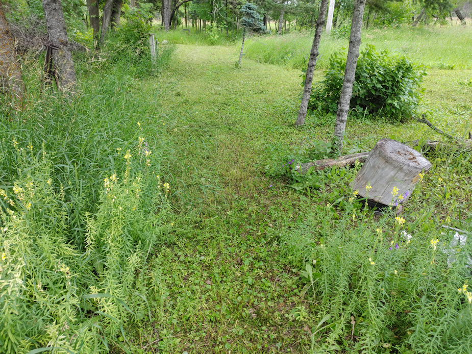 I was able to get more done around the outhouse, and some of the area behind the three low raised beds near the compost ring. I also got some of the area in the spruce grove cleared. Nowhere near what needs to be done, but I at least cleared the stumps from the dead trees I cut down last year. The grass and weeds were so tall, the stumps were completely hidden, as was a tree top that fell in high winds a while back. That needs to be dragged out to the branch pile for chipping. It’s next to the dead tree marked with an orange X in the background. We’ve done no clean up in the spruce grove at all this year. The spirea is reclaiming much of it, even though I pulled them out by the roots as much as possible. They spread so fast! The Saskatoon berries can be picked, but they’re hard to get to with the undergrowth. Plus, the deer at the lower branches and twigs, so the only berries are way up high. The bushes are flexible and can be bent down to reach. I’ve made no effort to gather any. I’ve tasted some, and they’re not very good this year. Plus, a lot of them have … stuff… on them. Some, it looks like an orange powder. Others, it’s a tan colour that look like spores. Things like that. We had only one good year of berries since we uncovered them, but it looks like whatever fungus or mold or whatever that has been affecting the Saskatoons in other areas has hit these ones, too. I think we’re just going to have to bite the bullet, take them out completely, and buy healthy trees – making sure to plant them well away from where they are now! I’d had to plant new trees, only for them to get hit by something in the soil that’s making these ones sickly.