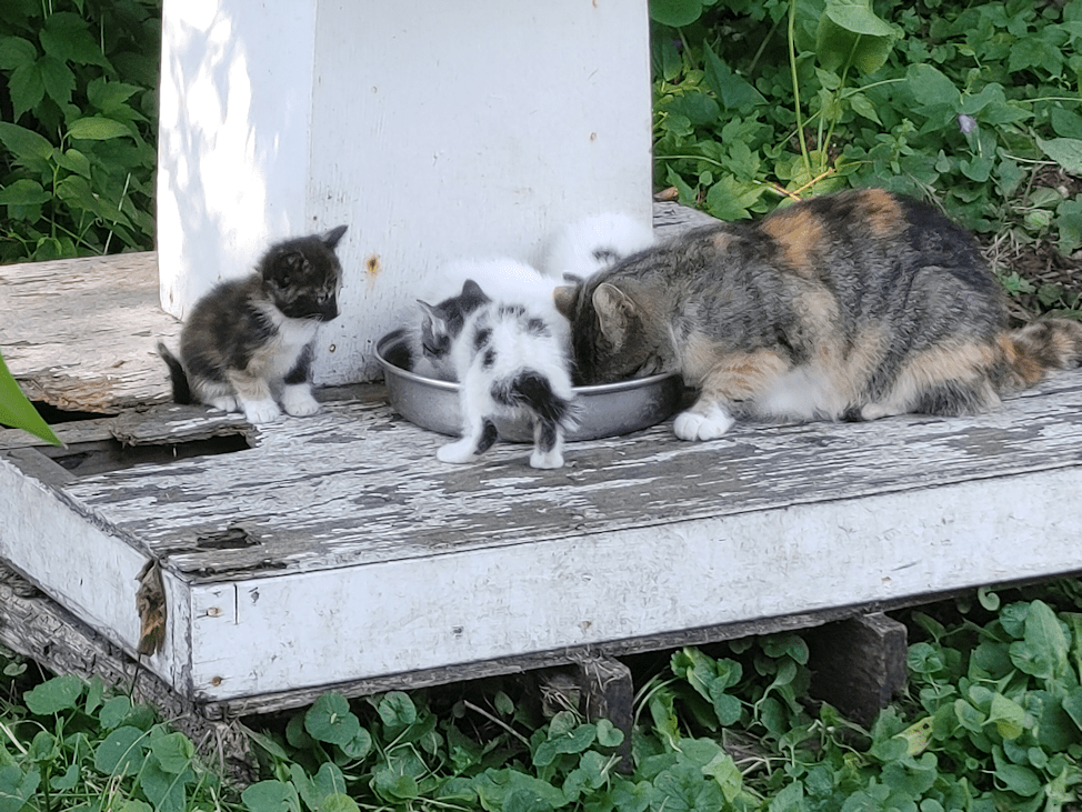 Shortly after, I spotted Rosencrantz with the newest kitties under the shrine – which confirms for me that this is, indeed, her second litter. The mostly white ones were with her, but I spotted some movement and waited until the dark one came out. Unfortunately, with its siblings climbing right into the kibble bowl, he couldn’t get at the food! Then he saw me and ran off. So I got another scoop of kibble and spread little piles around the shrine platform.