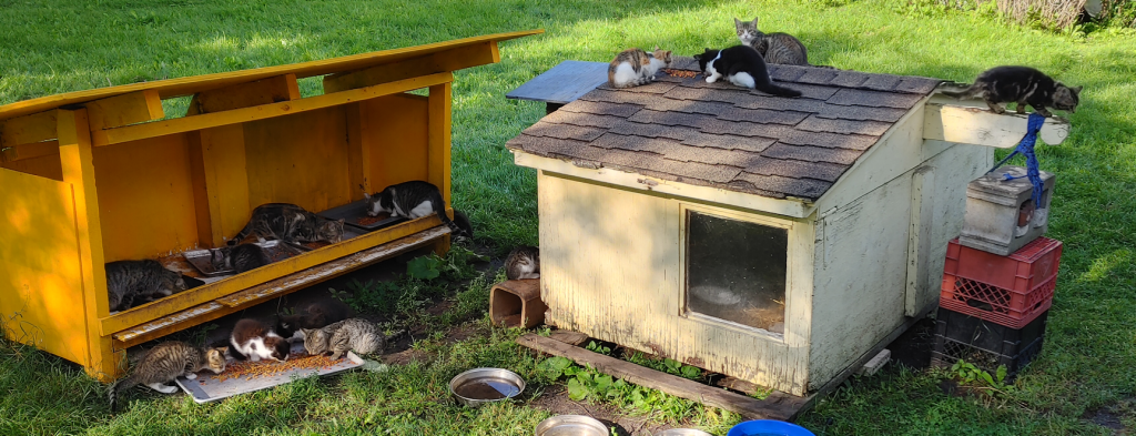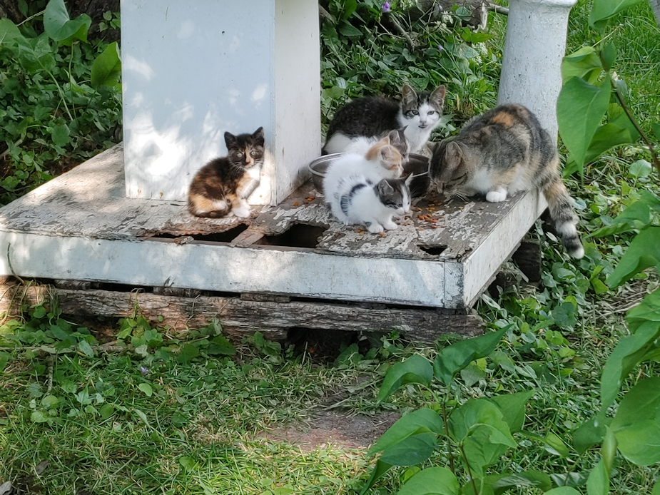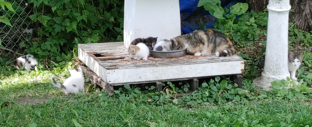 Here we have it. Finally! A photo with all five of Rosencranctz’s kittens in one shot! The spotted one on the far left tends to hang back while the others go for the food, and tends to be the first one to run off when I come around.