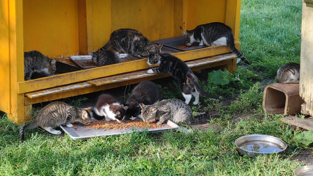 Rosencrantz and her crew had company this morning! The catten that looks quite a bit like Junk Pile – but with a distinctive black lower lip! This one tends to show up alone, and I’ve yet to see it with any of the adults in a familial way. Here, Rosencrantz tolerated it for a very short time.
