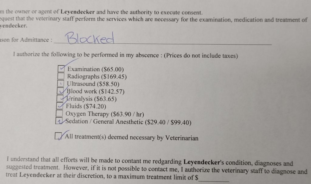 Once the vet got the okay, she quickly weighed him – he is 8.6kg/19 pounds – then rushed off with him to their kennel, while they prepped to put him under and get a catheter in him. I waited until someone else came in with the authorization form to sign.