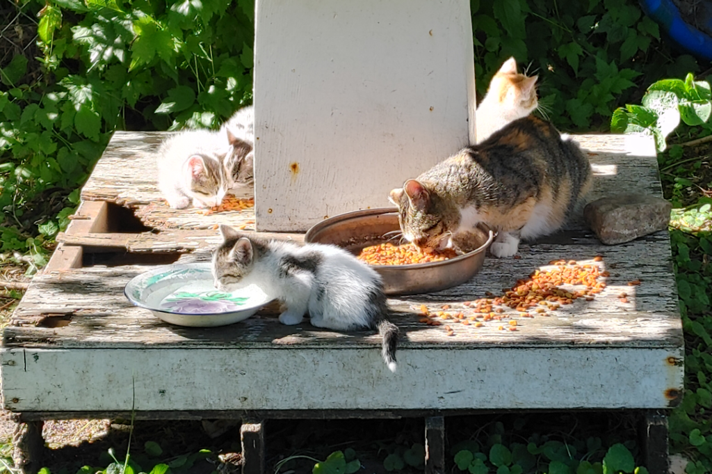 As these little guys aren’t up to going to the kibble house, yet, I brought over a bowl for water as well as kibble. Now that they are eating solid food regularly, I figured Rosencrantz could do with less kitties still nursing because they are thirsty.