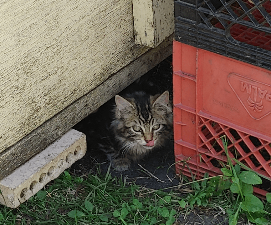 I spotted him without other cats around. He ran under the cat’s house, so I left some treats out for him.