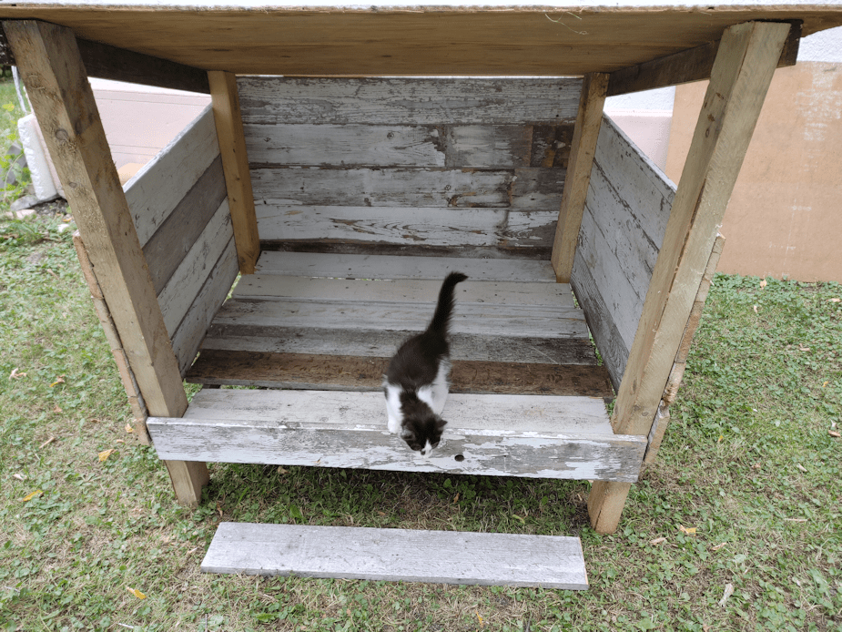 Construction is almost complete. A couple of floor boards are not nailed down yet. It got too dark to see. The scrap boards used for the floor and walls are pretty old, and there was a fair amount of rot on the ends. For the walls, I laid the boards so that the strongest wood could be nailed in place, then the rotted ends were sawed off. The same boards were used for the floor. Since this is to hold water bowls, there are spaces left in between, so that if any water spills, it’ll run through the gaps and not accumulate inside.