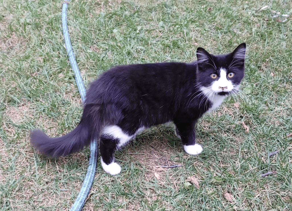 His siblings include the super fluffy cat we’re trying to socialize for a family that wants him. My daughters have been trying to spend time outside to socialize kittens, too, and my younger daughter actually got to touch him! That’s the most progress any of us have managed so far. It’s really hard to socialize kittens, when their own mothers won’t let us near them. π