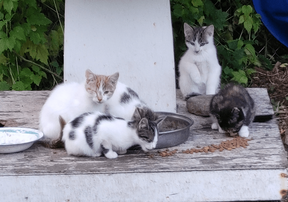 Then I aw a white and grey kitten come out from under the cat’s house, see me, and go hiding again. With these ones still under the shrine, that meant it was one of the pump shack kittens! I don’t know how many of them are coming to the house. I still drop kibble off in a tray in front of the door, but I don’t go in. I do hear noises from inside, so at least some of them are still using the pump shack.