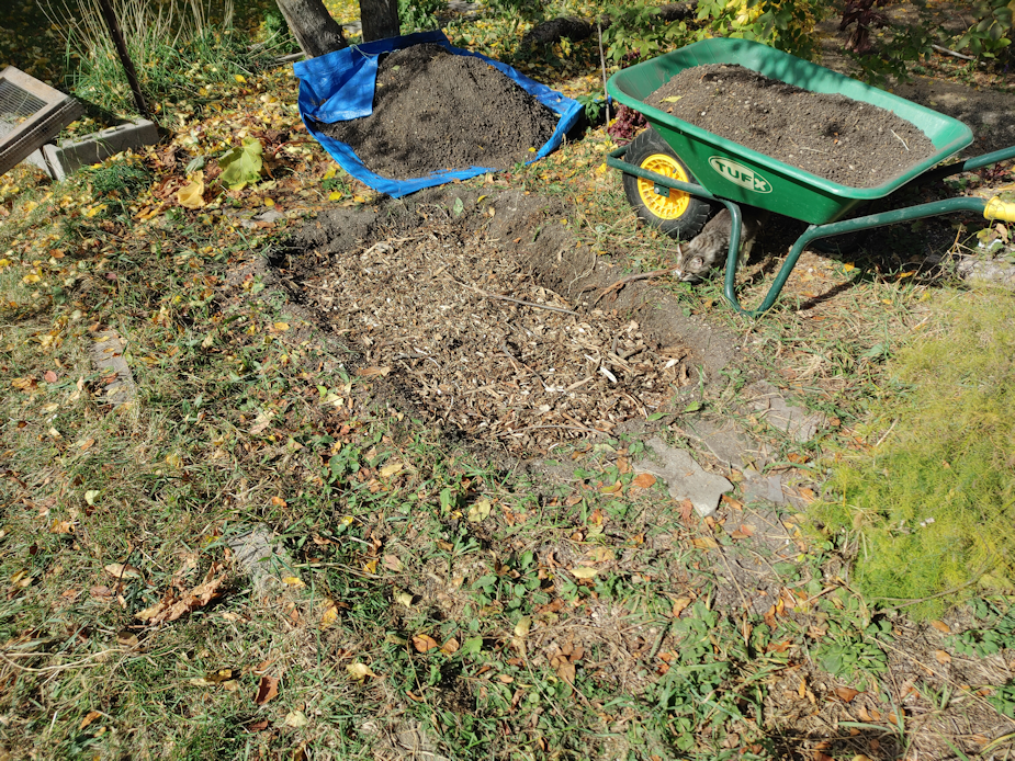 The soil was really, really dry, though, so my first amendment was a layer of wood chips, to act as moisture absorbing sponges as they break down. I’ll be adding other layers of organic material before putting the soil back, but first I wanted to build walls.