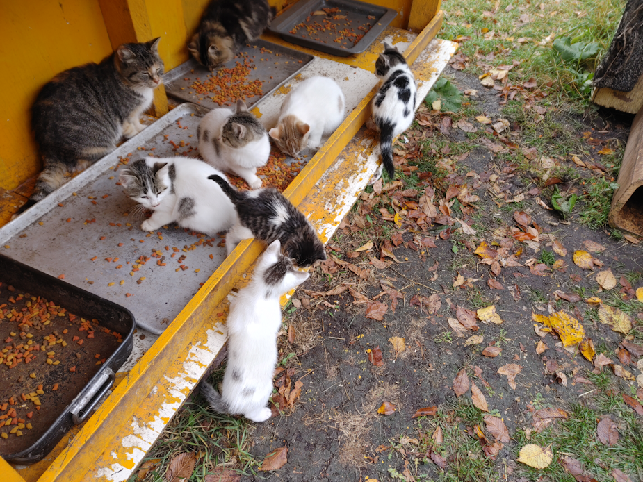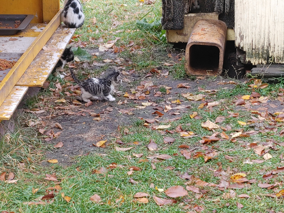 Eventually, I put it in the cats’ house, which is the warmest, driest place for it. It stayed there for a while, but when I came back later and it saw me, it started coming out. Then more cats came around.