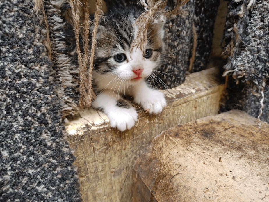 It kept going from kitten to kitten, looking for mama. I put it inside the kibble house – it’s so small, it can barely climb over the board that keeps the trays from being knocked to the ground.