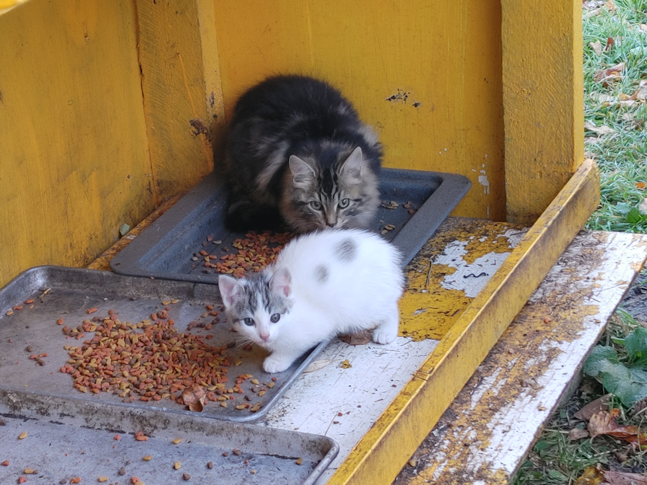 I will no longer be putting kibble by the pump shack door. The kittens seem to have all moved closer to the house, so at this point, it will just attract things like skunks or raccoons. I brought over the kibble tray and will later tuck it just inside the entry into the cats’ house.