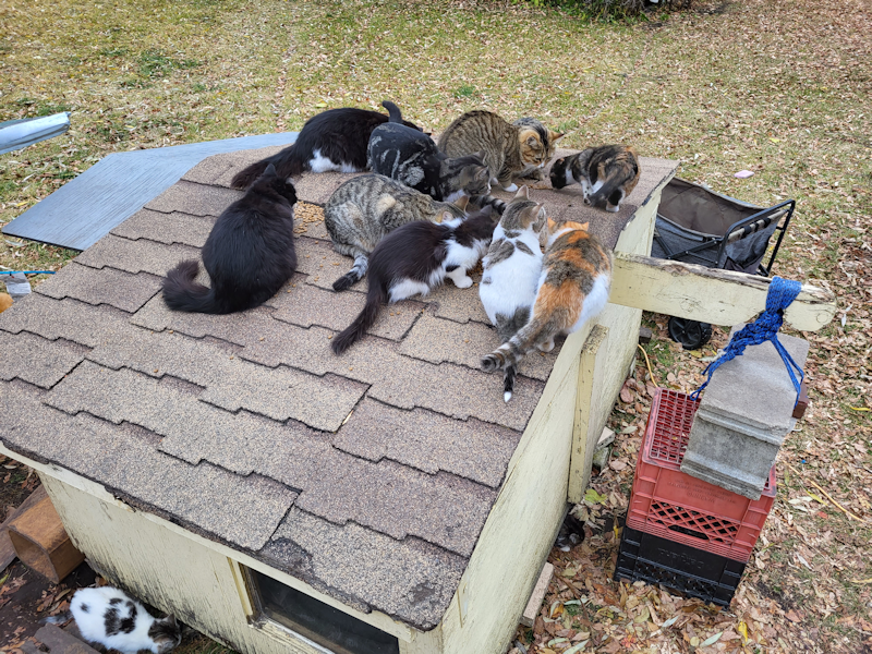I counted 29 of them this morning! Unfortunately, I found the ramp board into the cats’ house was knocked down. I fixed it, but I think the bitty baby ended up spending the night under the cat house instead of in it. You can just see his head poking out near the counterweight, where I leave some kibble. Quite a few of the smaller kittens prefer to be under there.