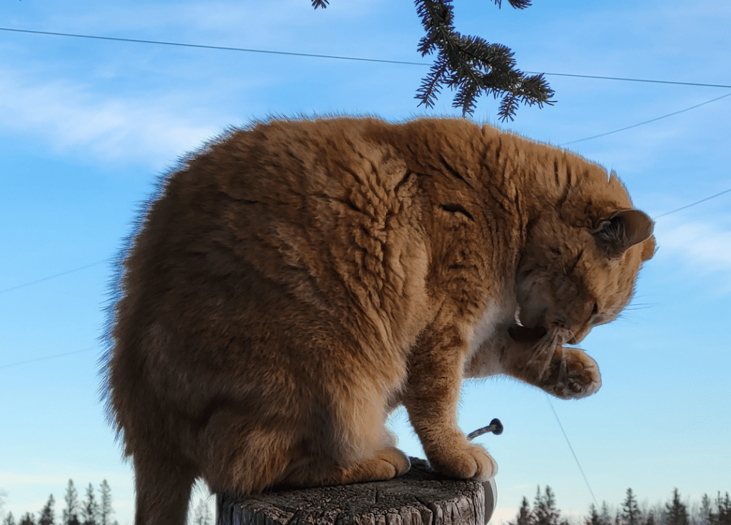I love how the bright blue sky really shows how thick her undercoat of winter fur has become.