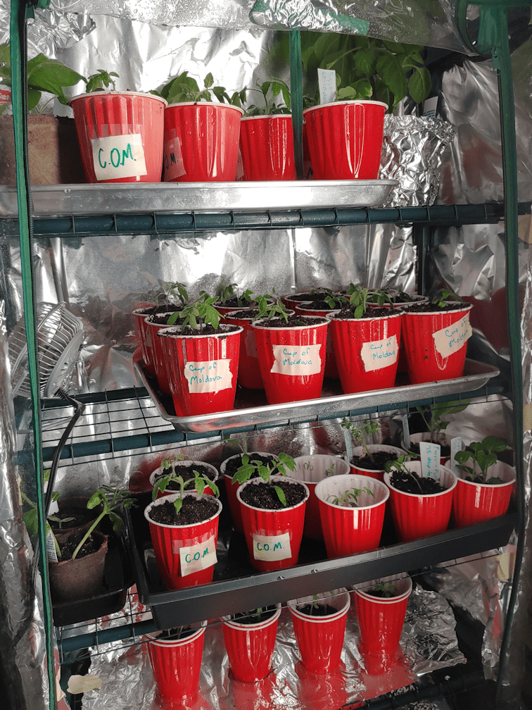 Eventually, we were able to move the largest seedlings onto shelves in the sun room, while other seedlings got rotated into the mini greenhouse, and newly sown trays were set up in the aquarium greenhouses. We had our seeds organized by when they needed to be started, with the earliest started 10 weeks before our average last frost date, then 8 weeks, 6 weeks and finally 4 weeks.