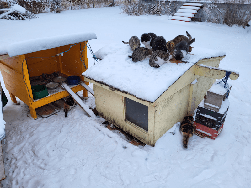 By the time I’m done my morning rounds, the outside cats have finished eating and are settling into their favourite spots to hang out. The littles just love sitting on top of the board the heat bulb’s fixture is attached to! They don’t hang out under the bulb, which you’d think would be warmer. They like to be above it!
