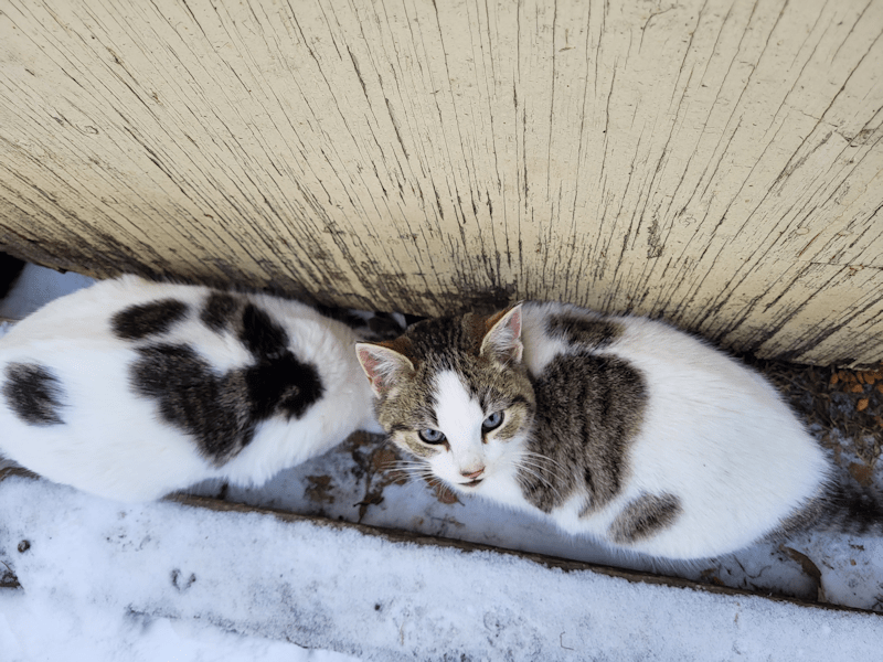 After I got this photo, I was able to reach out and pick it up for the first time. I was careful to just hold it close and give it ear skritches and gentle pets, so it would associate human contact with warmth and pleasant feelings. Then I put it onto the kibble tray inside the entry to the cat house, rather than back in the snow. Yes, I could have brought it inside, but this was the first time it was held, and I didn’t want to traumatize it by taking it away from its mother and siblings so suddenly. I’d rather go slowly, while that’s still an option.