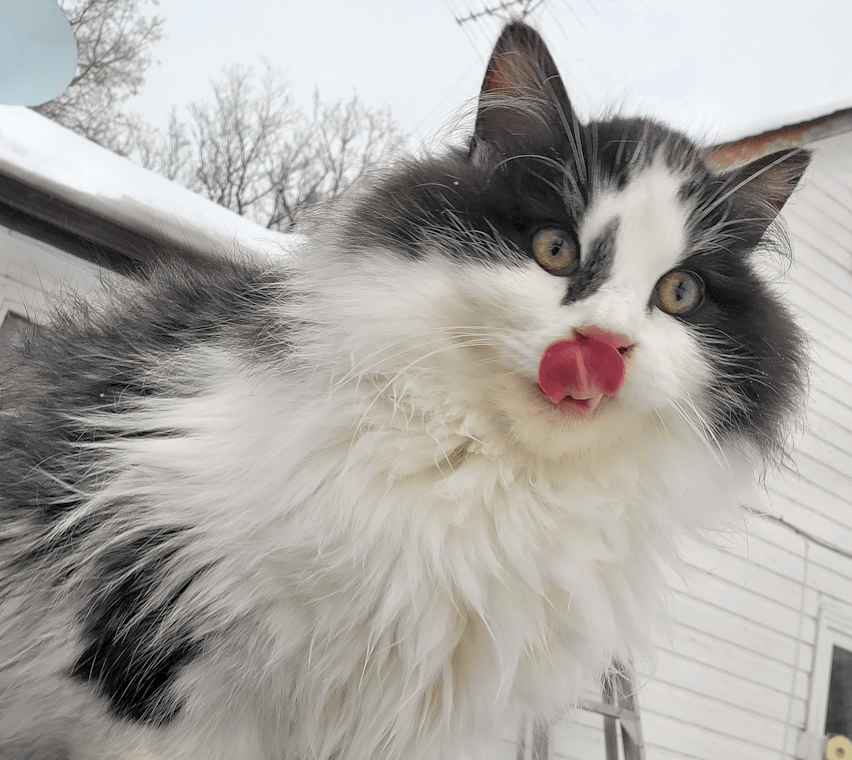 I forget what name the girls gave him, but he actually came over and allowed me to pet him! Of last summer’s long haired kittens, he has the most black, and he has no injuries at all.