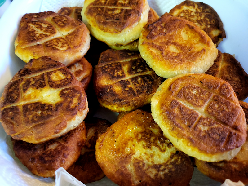 Lard has a high smoke point, so I could do these at almost deep fryer temperature. The higher the temperature, the less fat gets absorbed by the food. After cooking, they got laid out on a paper towel lined dish. They came out nice and crispy on the outside, with a smooth texture on the inside, and not at all greasy.