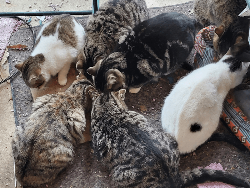 The grey tabby that has suddenly become friendly – it’s the one between the black tabby and the white and grey at the top – managed to sneak into the old kitchen while I was coming out with kibble. He not only let me pet him, but I was able to confirm he is male.