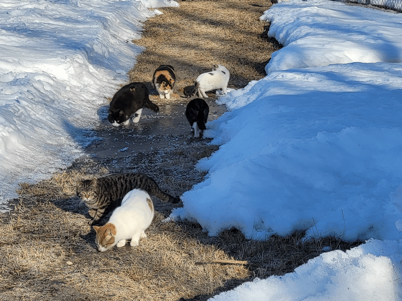 Also, I counted 24 this morning. When we got back and finished unloading, I topped up their food and water, and The Distinguished Guest was there! I’ve been seeing him more often of late, though yesterday, Shop Towel also showed up and there was quite the cat fight. No new injuries on TDG that we can see. He still looks very rough, but he’s no longer limping. Poor thing. He was so hungry, he almost let me touch him while he was in the kibble house!