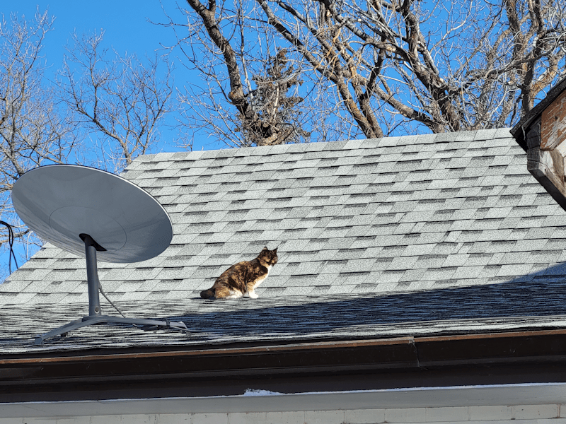 Some of the cats are enjoying the new roof! I think this is Sprout, but it might be Phantom. She was stalking something at the peak of the roof!