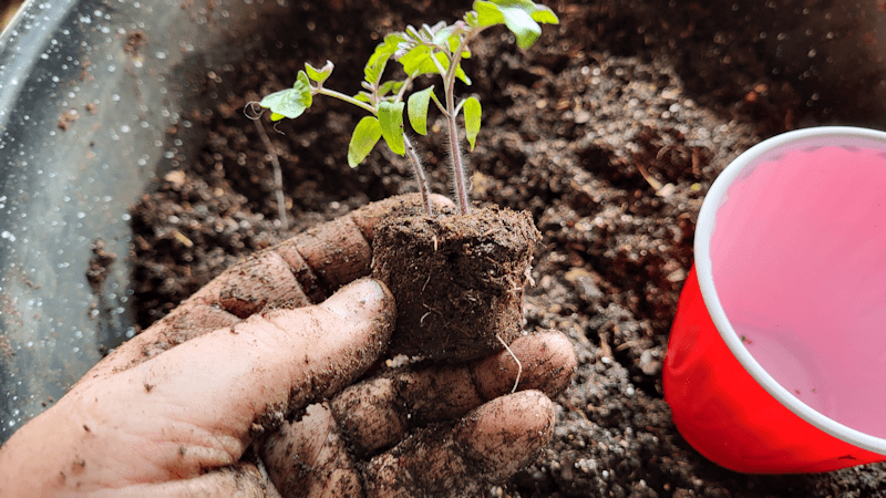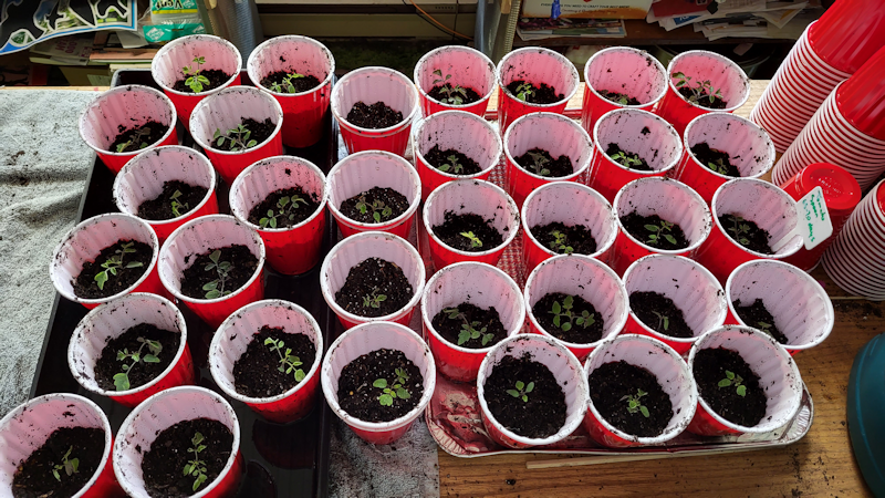 These are all 35 Spoon tomatoes (I’d mistakenly counted 36, before). I was able to fit 19 onto an oven liner tray, which will allow for bottom watering. The tray the Roma tomatoes had been in, which now had only the spearmint and oregano in it, could fit another dozen. That left only 4 that needed to be double cupped. I’ve run out of both trays and bins.