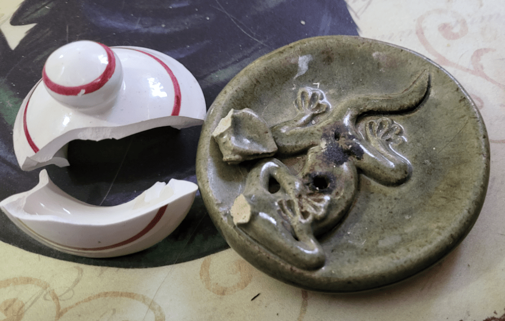 My lizard incense holder has lost his head! Sadly, the lid to my (fake) sugar bowl was cracked and (fake) sugar was spilled all around. The matching creamer was among the things broken by the movers, but I think I can glue these two back together.