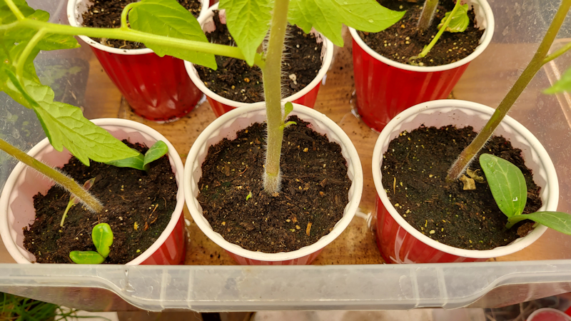 With the transplants, we have had a few losses. One of them was an African Drum gourd seedling that started dying when they were still set up in the living room. It never recovered, so I took the pot it was in and set it aside to make space in the tray. The pot, of course, dried out completely, so you can imagine my surprise when I saw green poking out! One of the drum gourd seeds that hadn’t germinated was breaking soil. So I found room for it in the tray with the one remaining luffa and watered it, and now there is a second seed germinating!