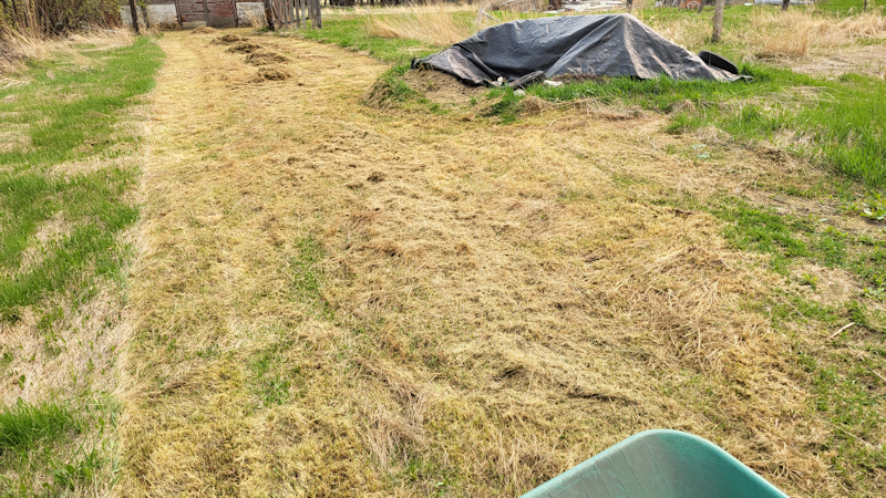 We got the small area we needed mowed clear; next priority is a path to the shed near the barn. Little by little, we’ll get the rest done, but the main thing is access to the garden soil pile and the barn. Raking up the clippings for use in the garden will help with the health of the grass, too, though it will likely take at least a couple more mows before we’ve dealt with all the old thatch.