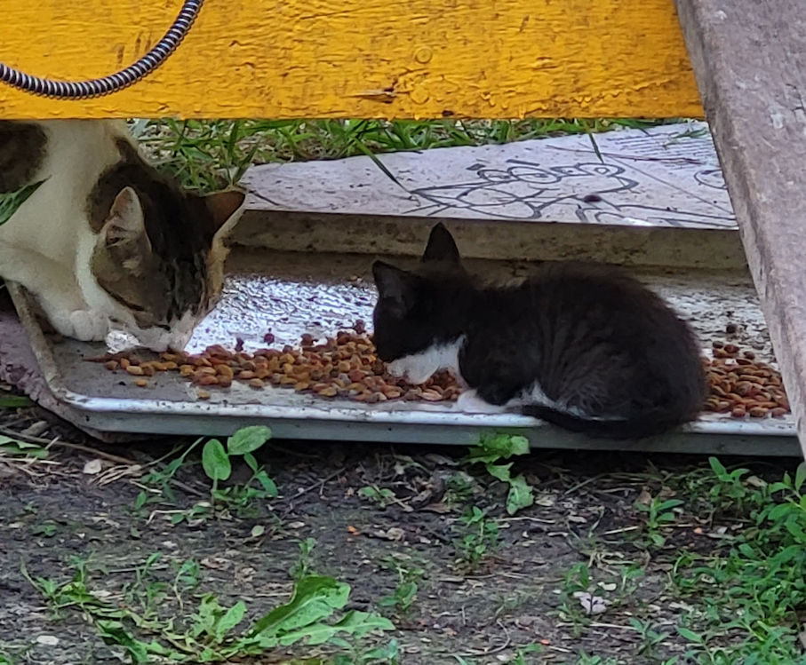 This kitten has moved right into the shelter area! He runs away from me, but waits until I’m fairly close before he does. For example, I was able to walk past him while he was on this rail, and all he did was tuck himself further under the rose bush.