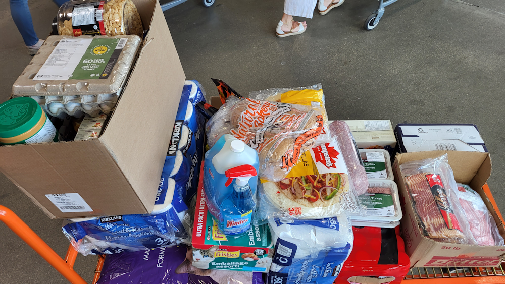 Pork chips: $20.10 lean ground beef, one package at $27.38, another at $26.29 ground turkey: $27.88, minus $5 at the till for a sale ground pork chub: $19.99 4 pk of bacon: $19.99 Marble cheddar: $14.99 Old cheddar: $14.99 Extra Old cheddar (a white cheddar): $19.99 two 1L cartons of whipping cream at $4.79 each 4pk of cream cheese: $9.49 Large bottle of Coffee creamer for the girls: $7.49 – that is typically a good price for the smaller bottles anywhere else! 6pk canned chicken: $17.99 (it’s actually gone down in price! A bit.) Walnuts for baking: $11.49 Butter, 5 pounds at $5.49 each 2pk of lemon juice: $4.89 Kirkland brand chocolate chips: $15.99 Glass cleaner; we keep losing our glass cleaner, so I got a set with one spray bottle and a huge refill jug: $17.99 Pork rinds (and this time I remembered to tell my husband it’s for cooking with!): $10.79 Iced tea mix: $9.99 Peanut butter, 2kg size: $10.49 Rotisserie chicken; two at $7.99 each 2pk rye bread: $4.49 two packages of tortilla wraps at $9.99 each A double flat of eggs (60 eggs): $18.89