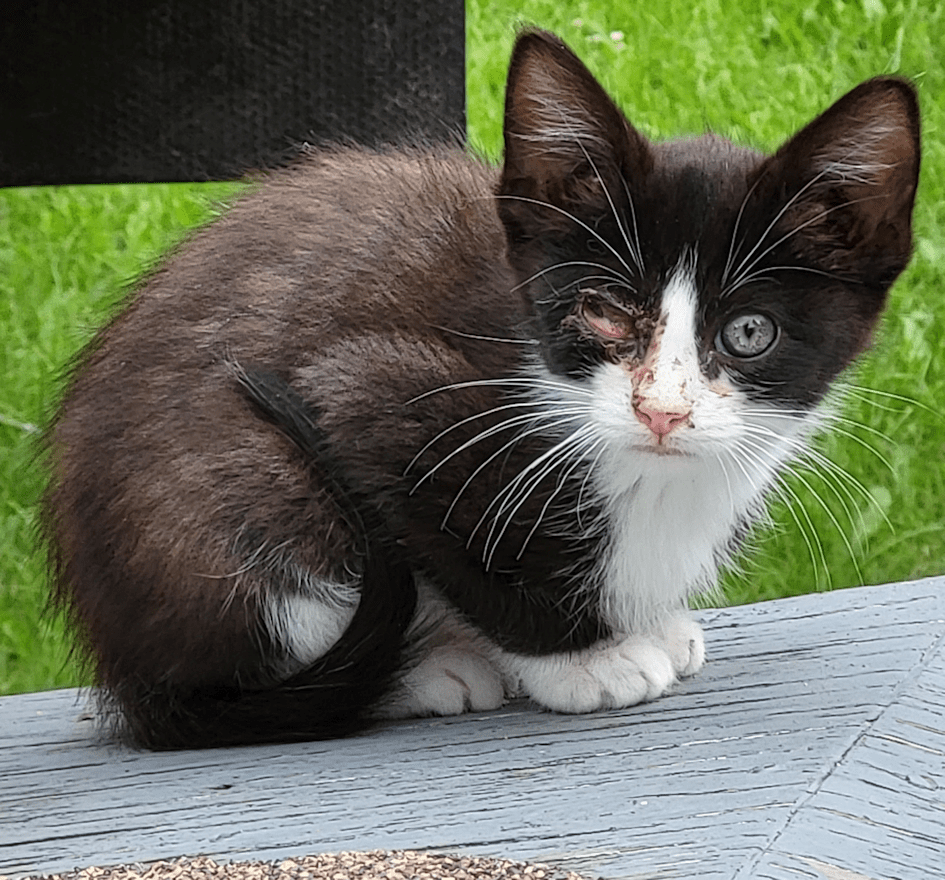 There are a lot of tuxedos among the kittens this year, and one of them has a really messed up eye. Not as bad as the kitten we got to the vet – at least not from what we can see so far – but still pretty bad. I did catch him once, but he really panicked and one of my hands got pretty scratched up as he made his escape. Today, I sort of caught him, but didn’t want to freak him out too much, so I gently held him in place and pet him, letting him go before he started to panic.
