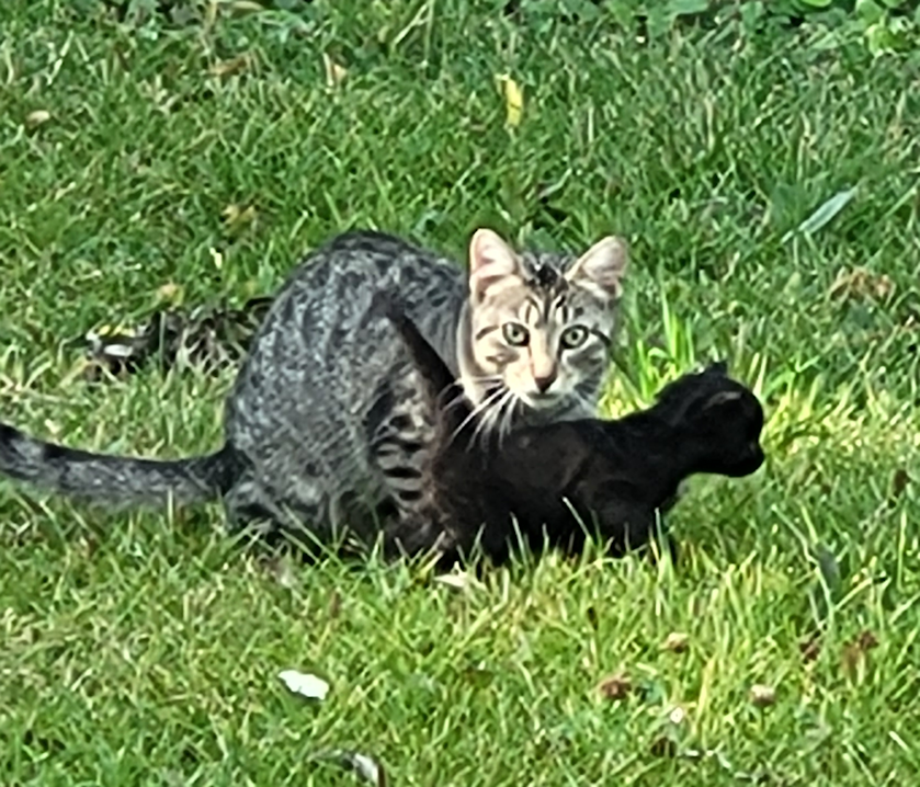 We did see her kittens, though, and figured out where their new “nest” is. It’s no longer in the tarp covered board pile (formerly known as the junk pile). They’ve found a way to get into the space under the concrete stairs outside the dining room door. A perfect spot for a mama and her kittens. Impossible for us to get at.