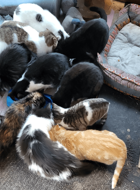 This is 10 cats eating out of 2 bowls! There was another 5 eating behind me as I took this photo. All total, I counted 33 or 35 cats this morning.