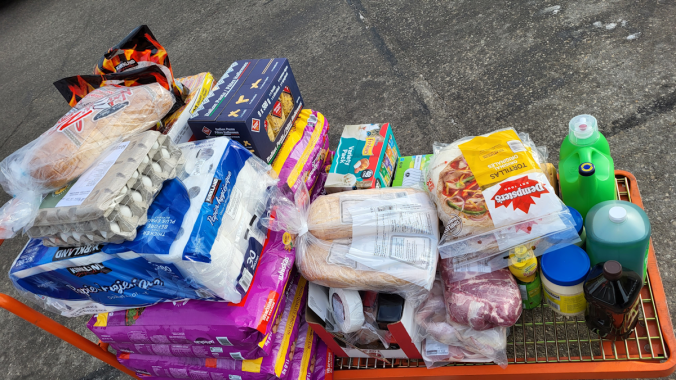 I can’t remember what else I got there right now, other than grabbing one of their food bank bags for the hamper. One bag includes pasta and pasta sauce, canned fruit, and a few other shelf stable items to make a complete meal for at least 2 people, with extras. The bag was only $9, which brought my total bill up to $108 and change.