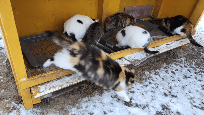 Barely visible behind the orange and white’s head is the little tortie. She won’t let us just pet her, but if we manage to pick her up, she will allow us to cuddle her. Being one of the only females we can actually touch, we have plans to bring her indoors as soon as we can. The calico is a priority, though, as she’s old enough to go into heat. Something that might actually happen earlier in the season, with our milder temperatures. That one, we just can’t get close to at all. Not even while they are all eating. With some of the other stand offish cats, I’ve managed to pet a few backs while they are eating before they run off. All seem to be males, of course. It’s hard to tell at times, because they move around to fast, but the older ones are a bit easier to spot.