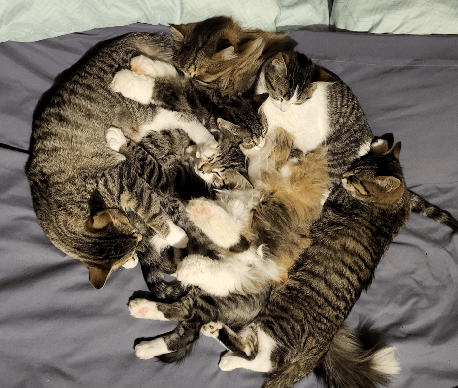 Would you look at that fur pile???? That is David, covered in kittens. Clarence on the left – he’s getting big! – Shadow in the Dark on the right, with Tin Whistle above him. On top of David, under his head and front legs, I see the pink nose of Mitzy, and finally, in the middle, with a paw in his face, is Pom Pom.