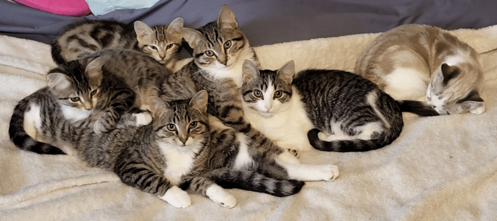 Would you look at that fur pile???? That is David, covered in kittens. Clarence on the left – he’s getting big! – Shadow in the Dark on the right, with Tin Whistle above him. On top of David, under his head and front legs, I see the pink nose of Mitzy, and finally, in the middle, with a paw in his face, is Pom Pom.