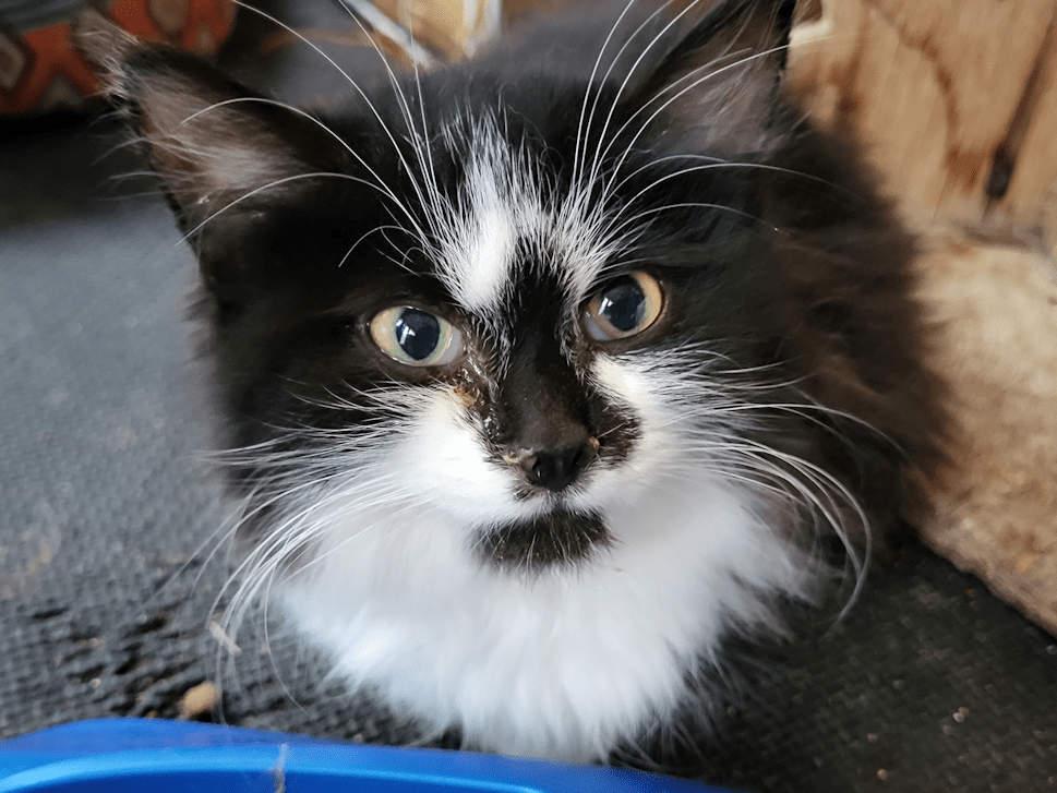 You can see the cloudiness in the kitten’s left eye in this photo.