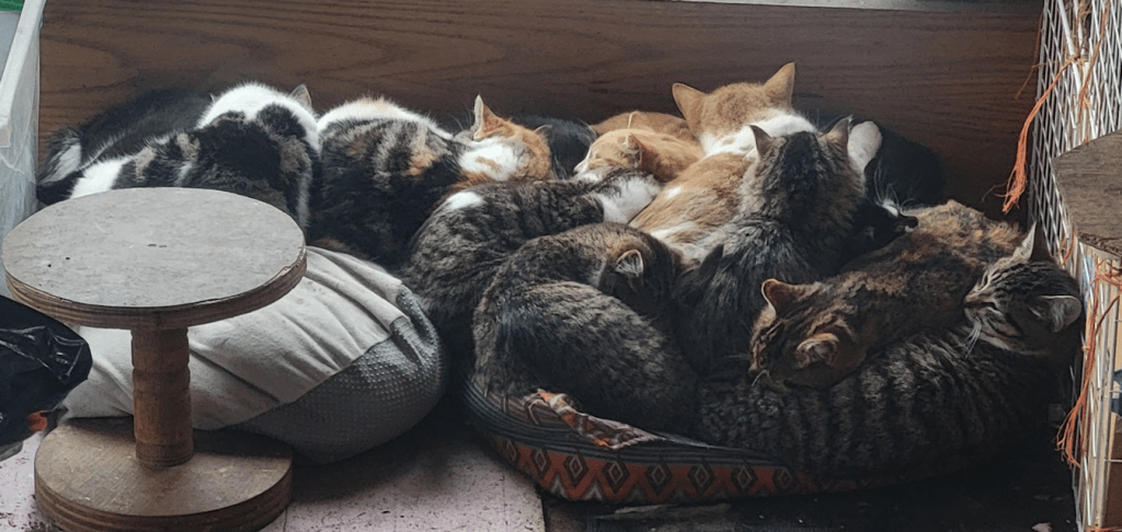 There is one cat “missing” from the pile. Hypotenose went into old kitchen while I was doing the kibble and warm water, and disappeared under the couch. Rather than try to dig him out, I finished my rounds, thinking he’d be at the door, wanting out, by the time I was done.